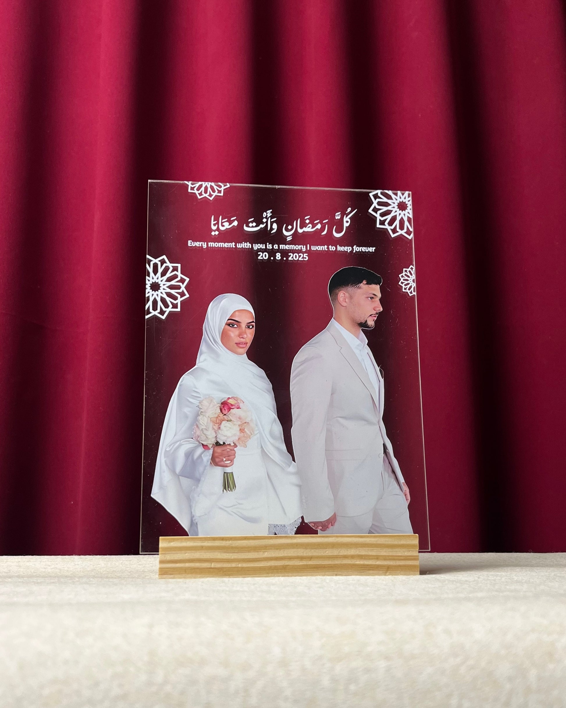 Designed with elegant Arabic calligraphy, your favorite photo, and a special date or message, this plaque turns precious moments into a timeless Ramadan keepsake. Crafted from premium clear acrylic and placed on a natural wooden base, it adds a peaceful and spiritual touch to any space.